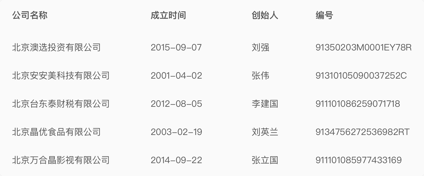 | 公司名稱 | 成立時(shí)間 | 創(chuàng)始人 | 編號(hào) |